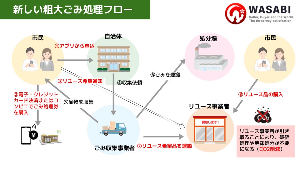 ワサビはリユース品特化型のEC一元管理システム「WASABI SWITCH」を提供しており、ワサビのシステム開発の知識と全国各地の様々なリユース企業との繋がりを掛け合わせ、さらに全国の自治体と協力することにより大幅な粗大ゴミの削減や環境問題の改善を行うことができると考え開発に至った。