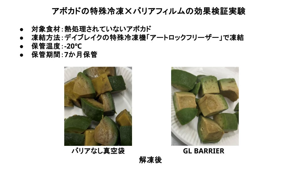 熱処理されていないアボカドをデイブレイクの特殊冷凍機「アートロックフリーザー」で凍結し、-20℃でバリアなし真空袋とTOPPANの透明バリアフィルム「GL BARRIER」の真空袋で約7か月間保管する実験を実施。その結果、バリアなし真空袋ではアボカドに褐変がみられた一方で、バリアフィルム「GL BARRIER」の真空袋ではアボカドの変⾊が起こらず、凍結前に限りなく近い状態を再現することができました。