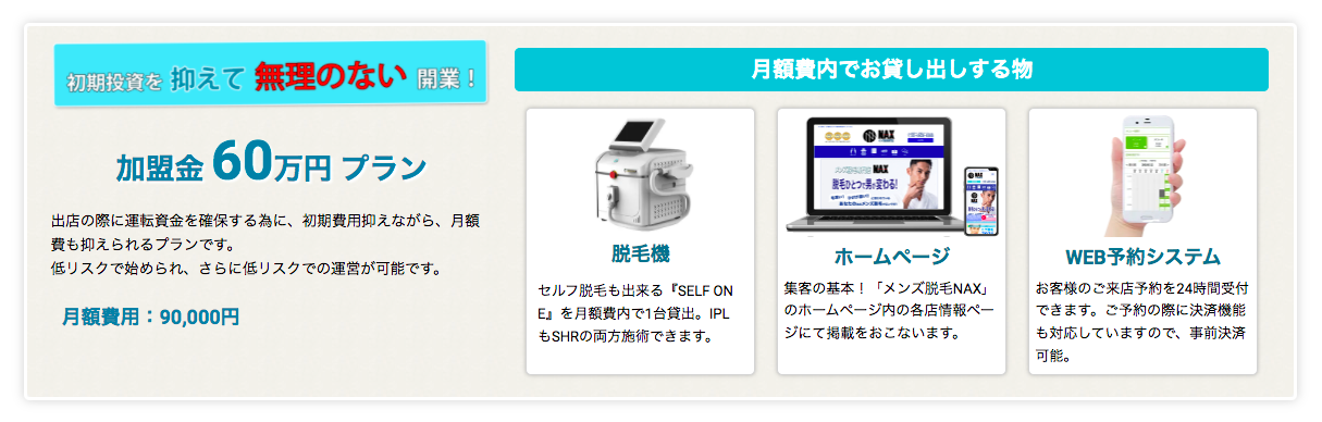 【メンズ脱毛FC】60万円で加盟!”脱毛機もセット”!メンズNAXのFC最新プラン登場!