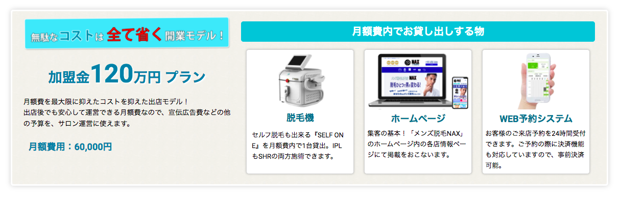 加盟金:120マン円 月額60,000円 脱毛機付き!