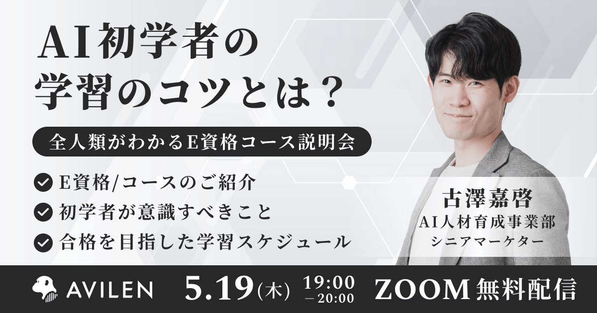 株式会社AVILEN(東京都中央区、代表取締役:高橋 光太郎、以下「AVILEN」)は、2022年5月19日(木)19時から、「全人類がわかるE資格コース」のオンライン説明会を開催します。