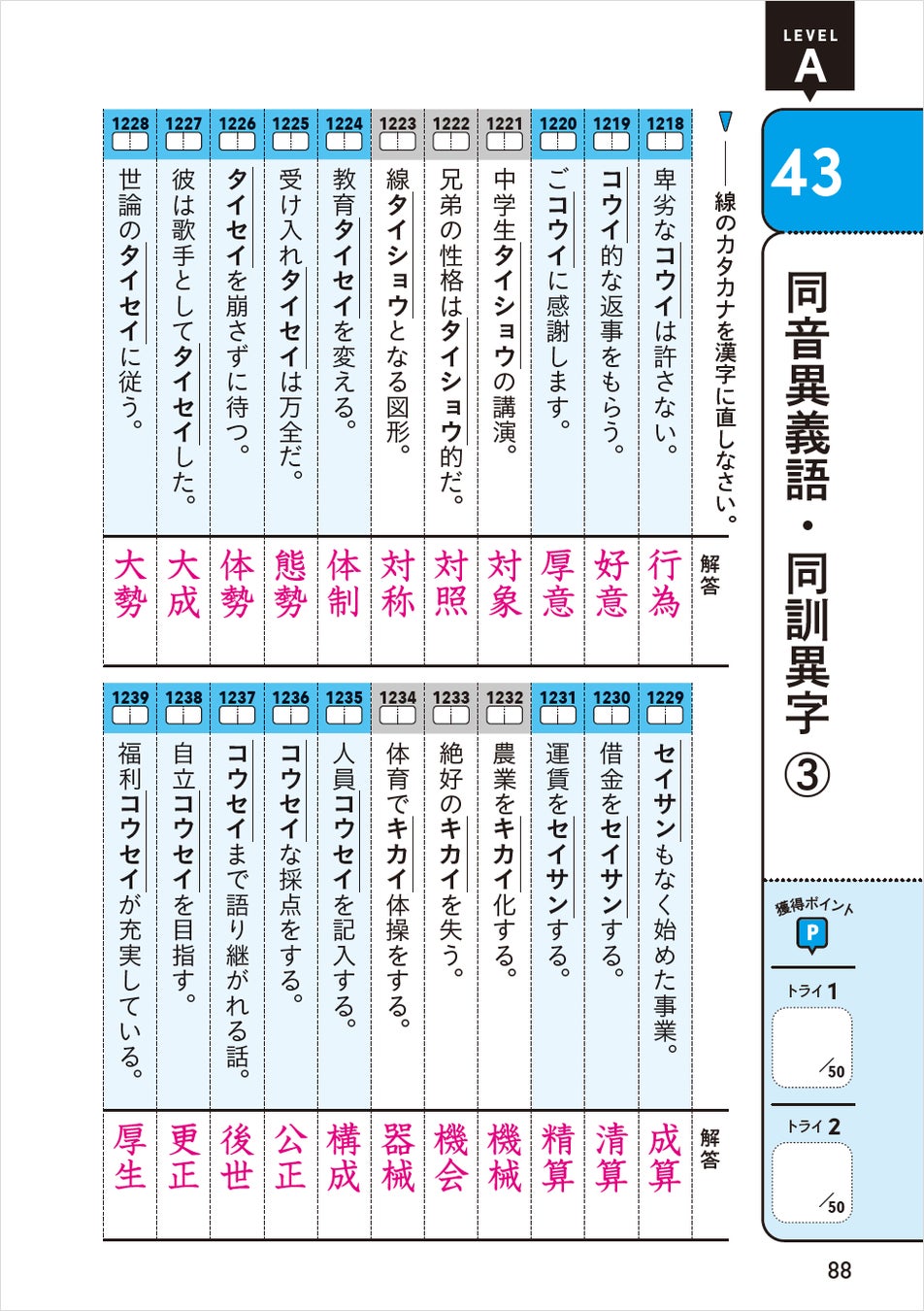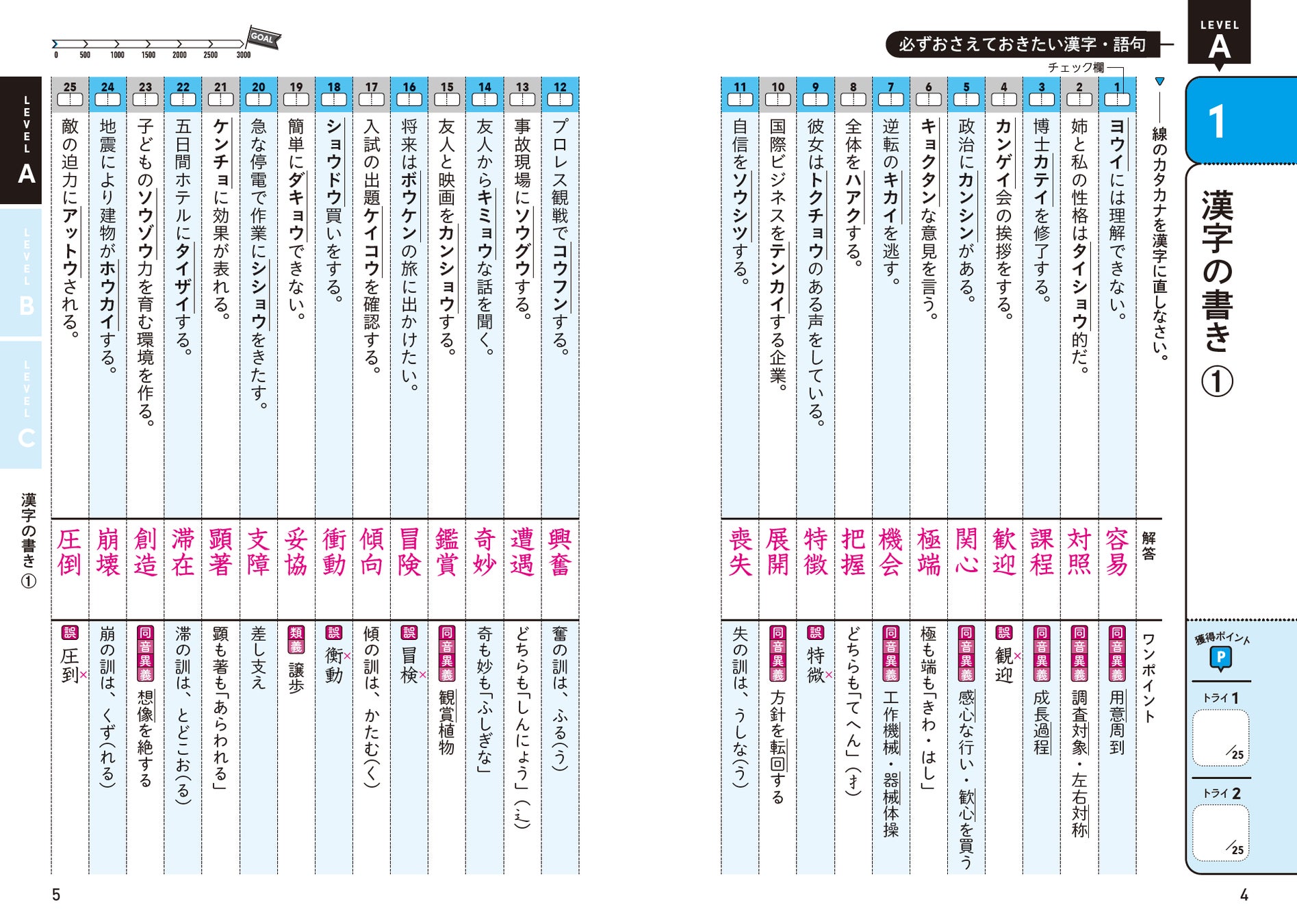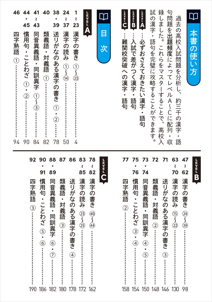 すべての学習項目を「必ずおさえておきたい漢字・語句」「入試で差がつく漢字・語句」「難関校突破への漢字・語句」まで、3段階のレベル別に分類しました。試験までの期間や理解度に応じて学習できます。