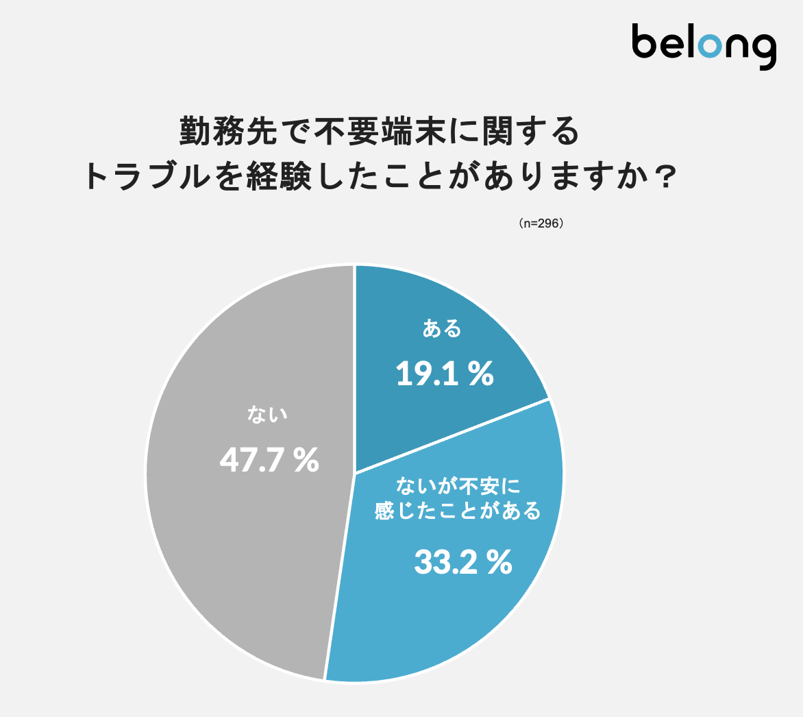 不要端末の管理を行う中で、トラブルを経験したことがある企業は19.1%でした。また、不安に感じたことがある企業とあわせると、52.3%が不要端末に関するトラブルに悩まされている状況です。