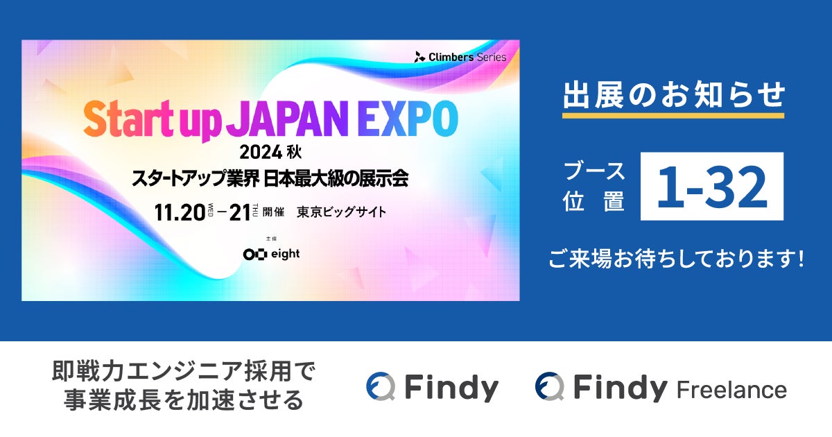 エンジニアプラットフォームを提供するファインディ株式会社(東京都品川区、代表取締役:山田 裕一朗、以下「当社」)は、11月20日(水)・21日(木)に開催される日本最大級のスタートアップ専門展「Climbers Startup JAPAN EXPO 2024」に出展いたします。