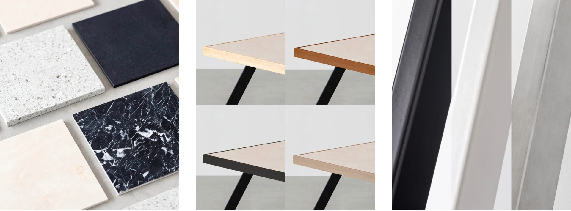<石材:5種 × 天板フレーム:4色 × 脚:3色 = 全60通りから選べる組み合わせ>