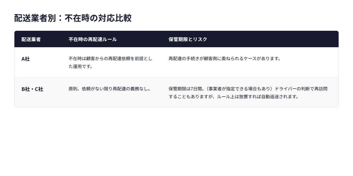 不在時は顧客からの再配達依頼を前提とした運用となるため、再配達の手続きが顧客側に委ねられるケースがある