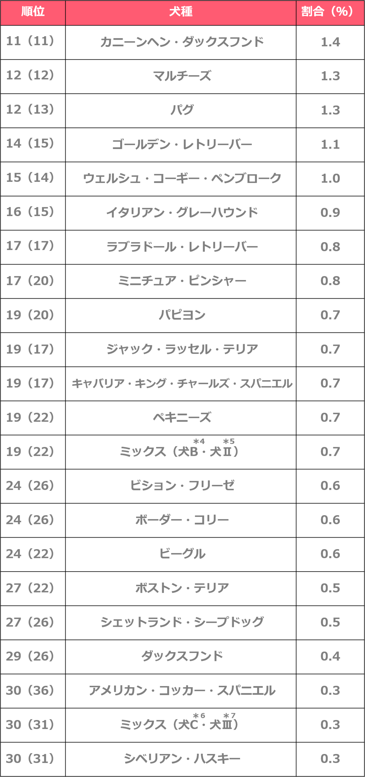 昨年同様、トップ10に引き続き、11位から30位までの中に小型犬種が多数ランクインしました。