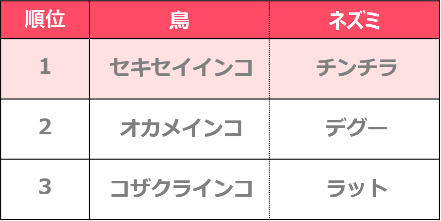 「鳥」のランキングと「ネズミ」のランキングでは、1位から3位まで昨年同様の順位となりました。カラフルな色合いが可愛らしく、好奇心旺盛で人間の言葉のマネをするのが得意な「セキセイインコ」は不動の1位を維持しています。「ネズミ」のランキングについても、第1位の「チンチラ」から第3位の「ラット」まで4年連続で同順位となり、高い人気を誇っています。