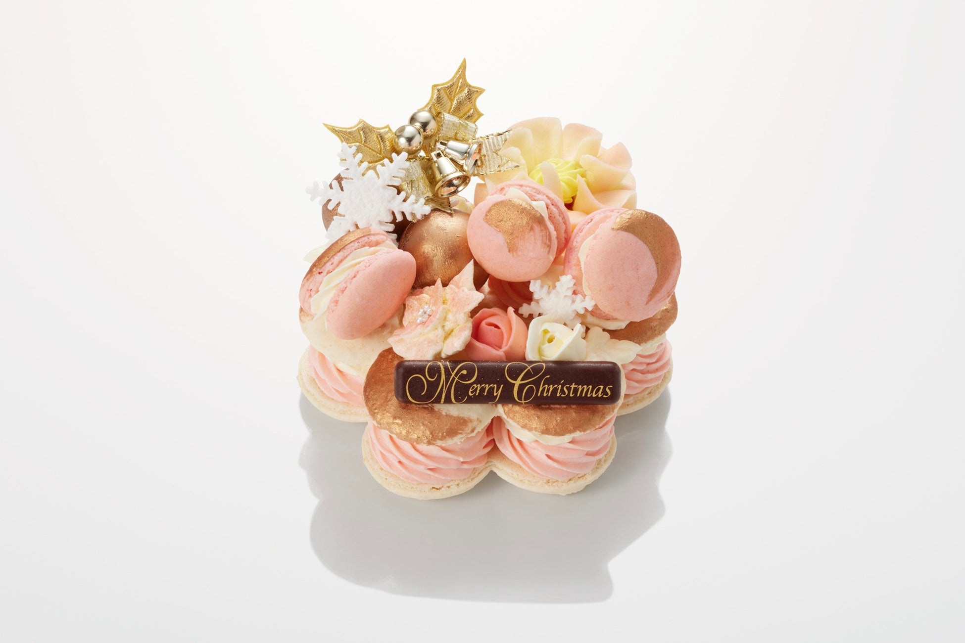 マカロン生地をリング状に絞ってクリームをサンドしたマカロンケーキ。花束をイメージして、クリームで絞ったバラとポインセチアでデコレーションし、バラのマカロンもトッピング。土台は苺のムースリーヌ、苺とフランボワーズの甘酸っぱいコンフィチュール、マスカルポーネクリームをマカロン生地でサンドし、甘味と酸味のハーモニーがお口の中に広がります。