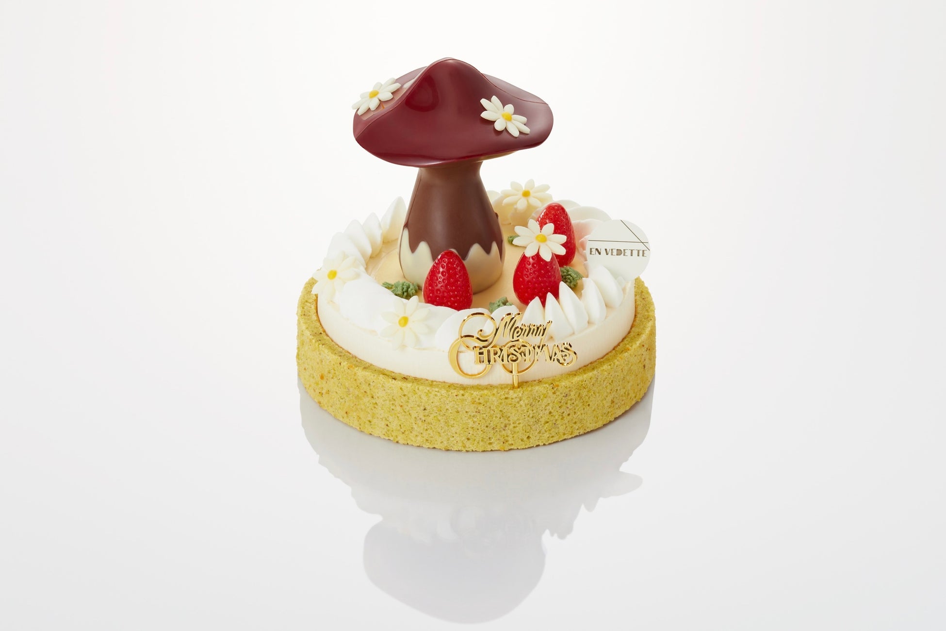 トンカをアンフュゼしたケーキに、アクセントでジュレフレーズ・クレームベリーとビスキュイピスターシュを合わせ、きのこと苺のチョコレートを飾りました。