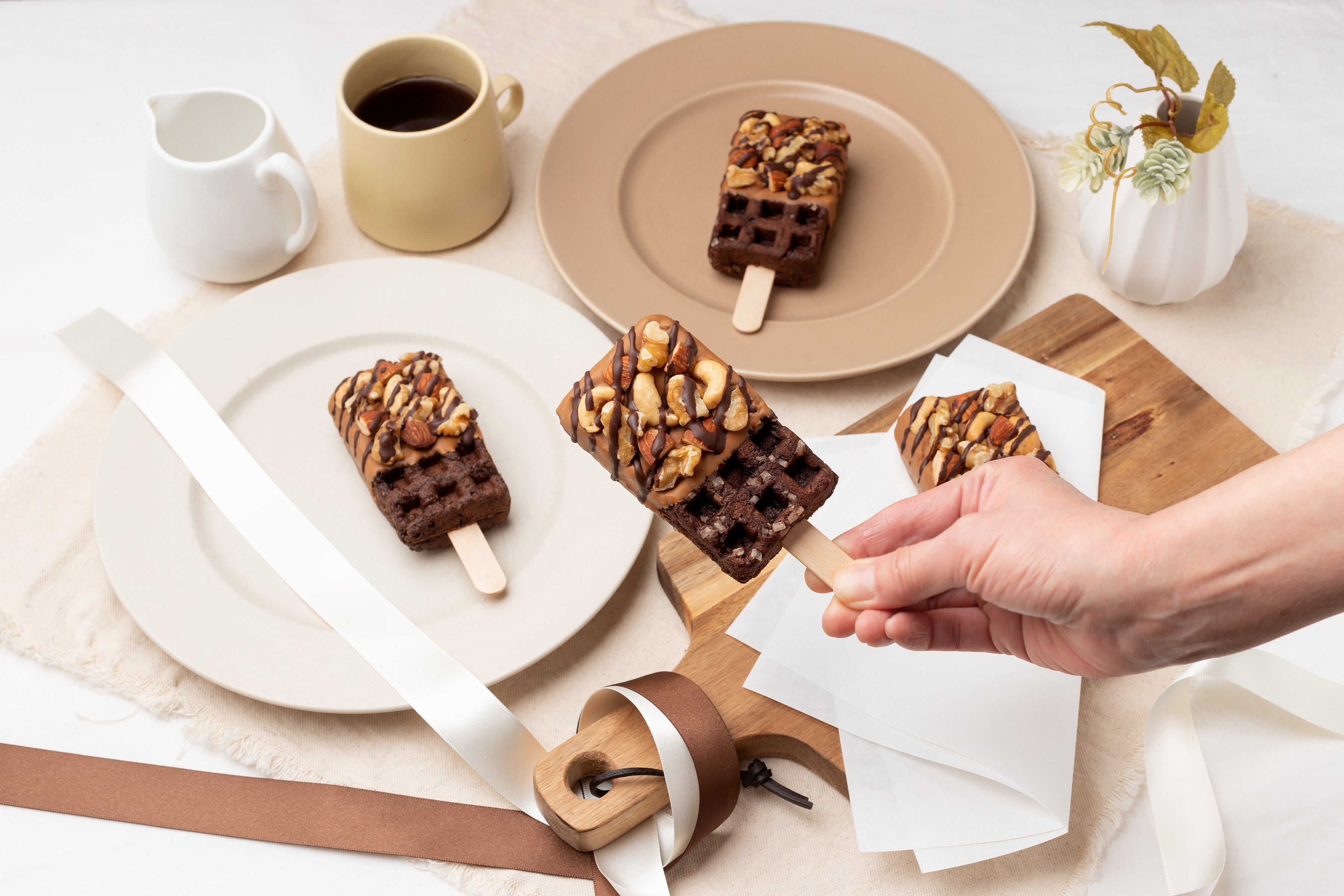大粒ザラメが入った京ワッフルの生地に、ココアパウダーをたっぷり練り込み、まるでチョコレートブラウニーのような、しっとり&濃厚食感に仕上げました。