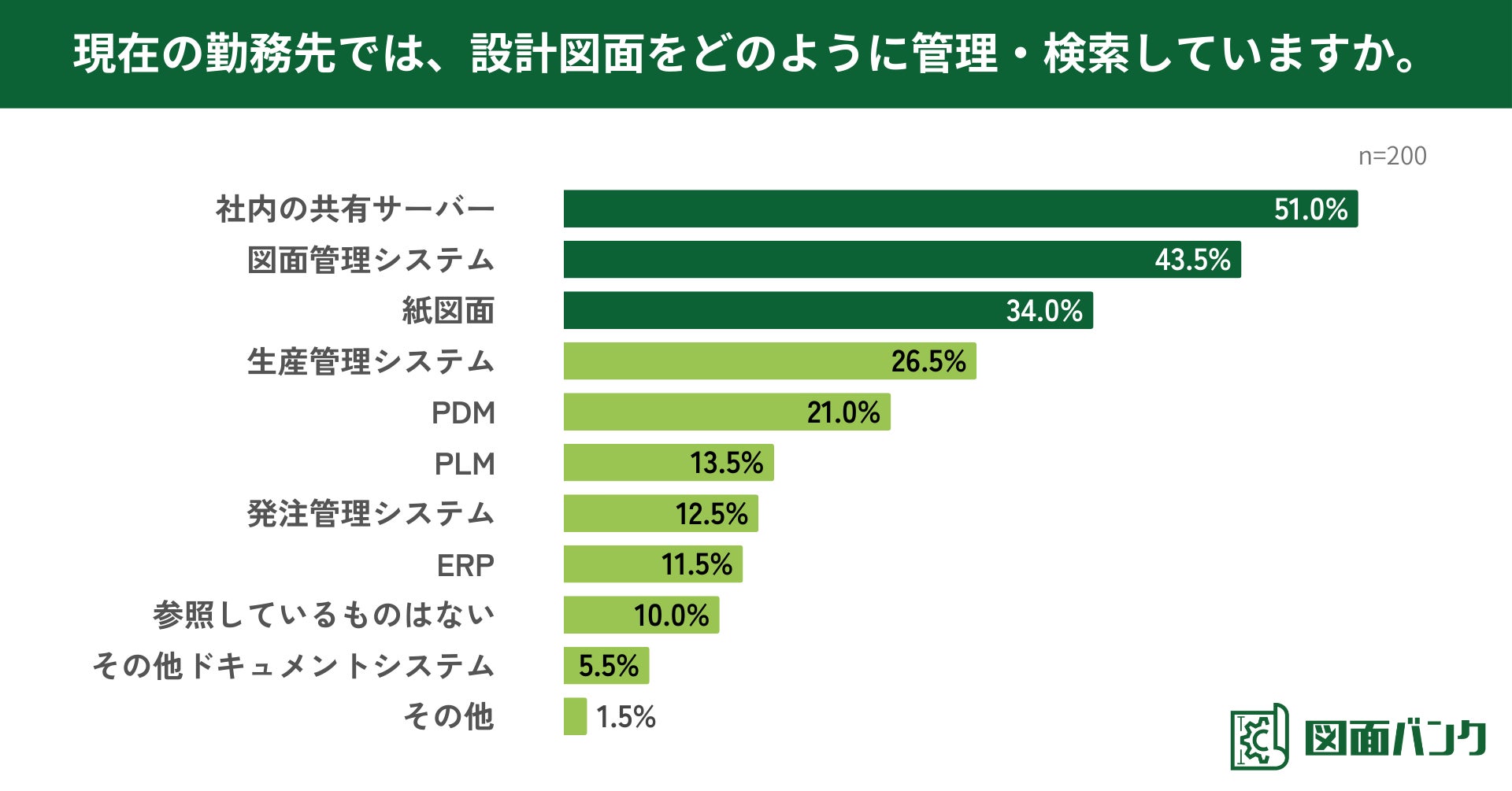 どのように設計図面を管理・検索しているか尋ねたところ、「社内の共有サーバー」が51.0%で最も多く、「図面管理システム」が43.5%、「紙図面」が34.0%と続きました。多くの企業で図面をデータで活用・管理している一方で、いまだに紙図面を利用している企業が約3割強にのぼることがわかりました(n=200)。