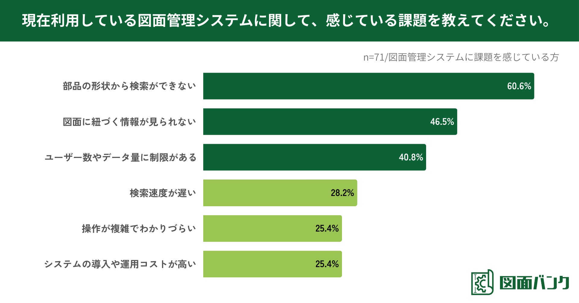 現在利用している図面管理システムの課題を尋ねたところ、「部品の形状から検索ができない」が60.6%で最も多く、「図面に紐づく情報が見られない」が46.5%、「ユーザー数やデータ量に制限がある」が40.8%と続き、図面管理のニーズに沿った機能の不足に課題を感じている方が多いことがわかりました(n=71/図面管理システムに課題を感じている方)。