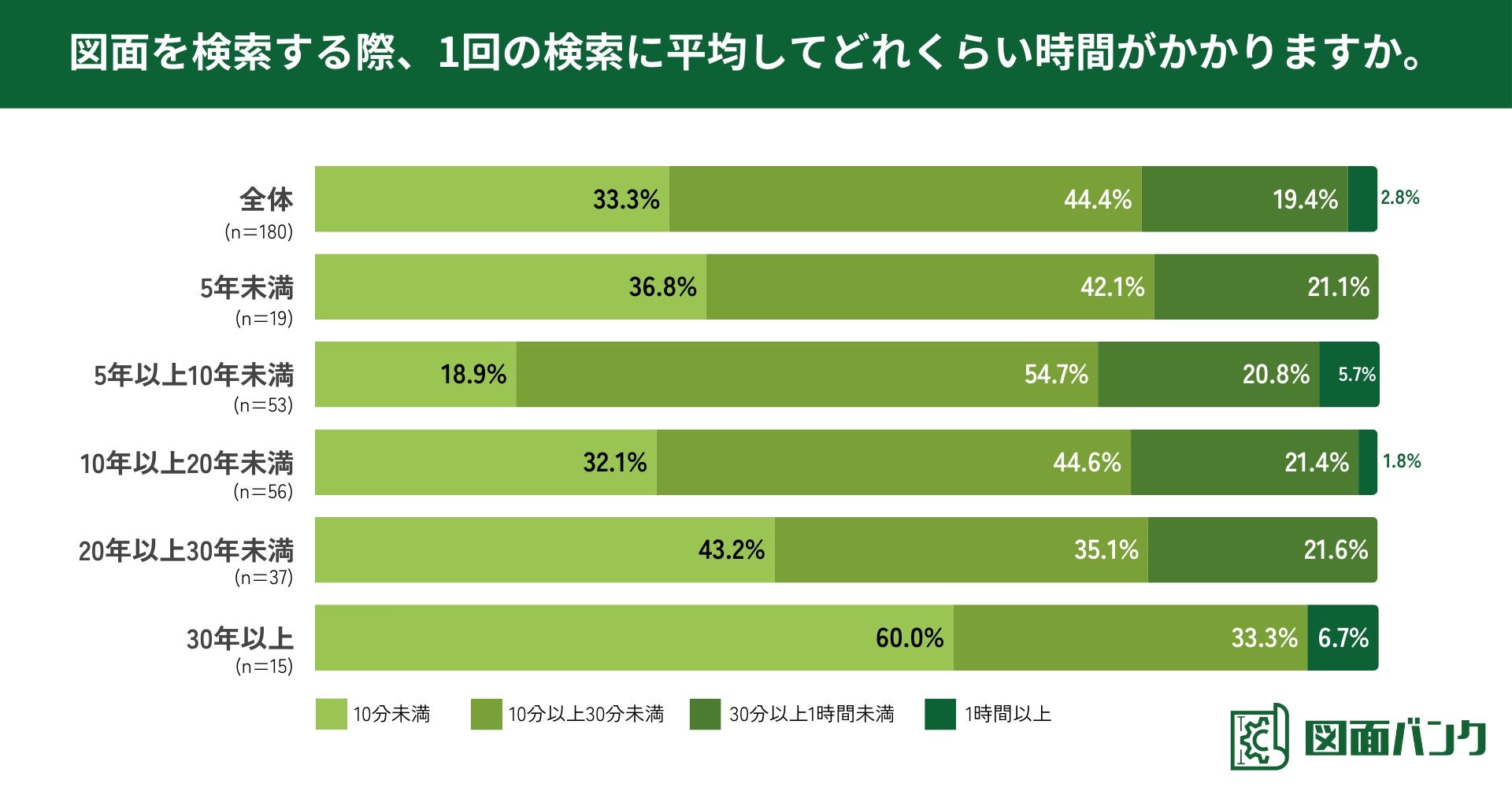 また、業務の経験年数別に検索にかかる時間を尋ねたところ、経験年数が長い方ほど検索時間が短くなる傾向がみられ、経験年数30年以上の方は6割が平均「10分未満」と回答しました。
