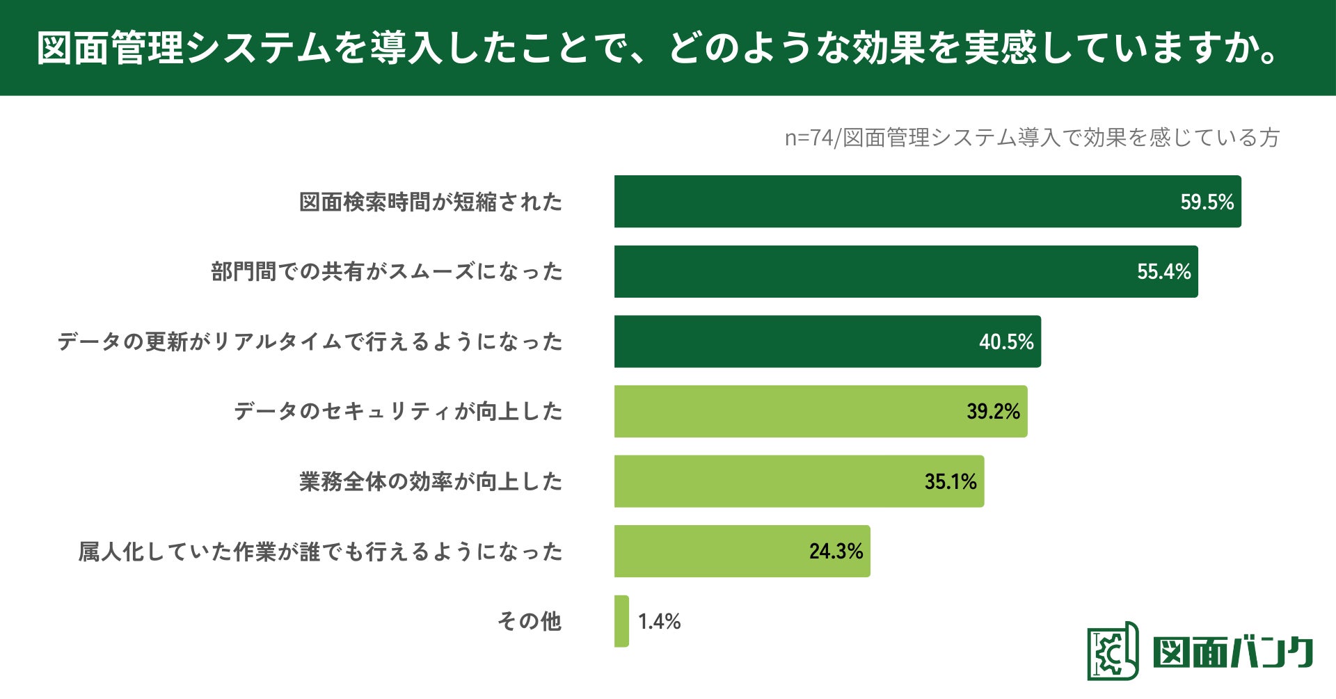 図面管理システムを導入したことで、どのような効果を実感しているか尋ねたところ、「図面検索時間が短縮された」が59.5%で最も多く、「部門間での共有がスムーズになった」が55.4%、「データの更新がリアルタイムで行えるようになった」が40.5%と続きました(n=74/図面管理システム導入で効果を感じている方)。