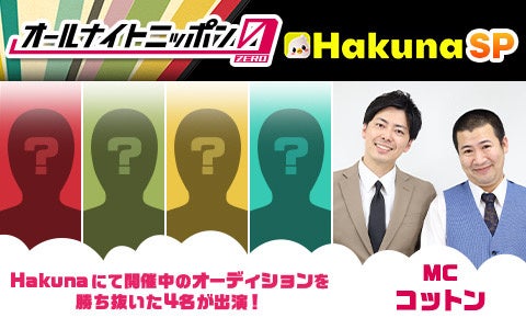 Hakunaで実施しているスペシャルオーディションとニッポン放送のラジオ番組「オールナイトニッポン0(ZERO)」がコラボした特番を、Hakunaにて独占動画生配信致します。