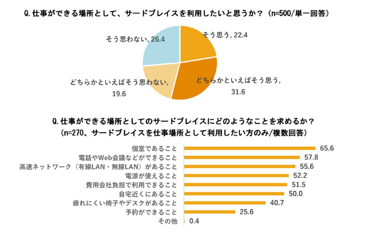 テレワークが浸透し、働く場所やコミュニケーションにおいて働き方が大きく変わる中で、オフィスでもなく、自宅でもない、仕事ができる場所としてのサードプレイスの重要性が高まっています。ブイキューブが実施した「クローズドサードプレイス調査」(2022年3月実施 / https://jp.vcube.com/news/release/20220324-1530.html)によると、働くためのサードプレイスに求める条件として、「個室であること」、「電話やWeb会議ができること」を望む声が多くなっています。