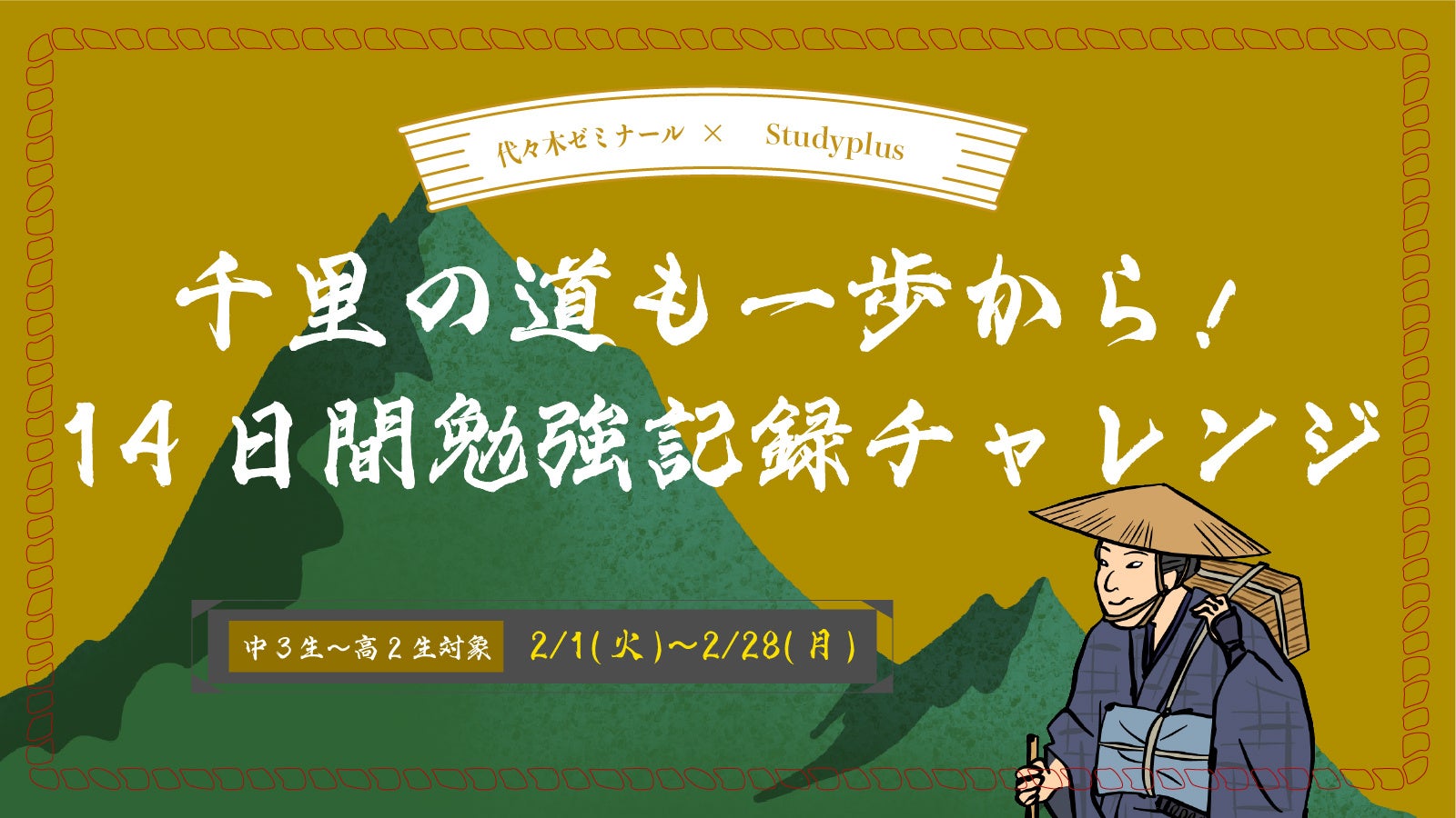 国公立・私立大学へ、多数の合格実績を誇る大学受験予備校「代々木ゼミナール」(本部:東京都渋谷区、理事長:髙宮 英郎、以下 代ゼミ)と、学習SNSアプリ「Studyplus」を運用するスタディプラス株式会社(本社:東京都千代田区、代表取締役:廣瀬 高志、以下 スタディプラス)は、2022年2月1日(火)から2月28日(月)までの間、学習SNSアプリ「Studyplus」内にてマンスリーチャレンジタイアップ企画「千里の道も一歩から!14日間勉強記録チャレンジ」を実施いたします。
