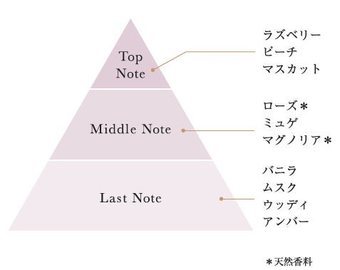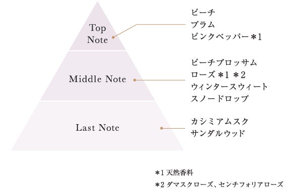 甘酸っぱいベリーやフルーティなピーチ、マスカットが、ホリデーのきらめきと高揚感を掻き立て、ローズやミュゲなどのフローラルが加わり