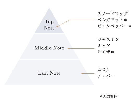 ジャスミン、ミュゲ、ミモザが繊細に重なって、雪原に差し込むあたたかな光を想わせる。