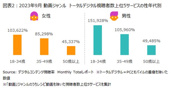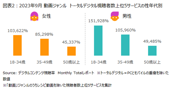 次に、利用者数Top 5サービスを合計したターゲットGRP(TARP)を性年代別に見ると、男性18-34歳で最も高く151,928%となっており、次いで男性35-49歳、女性18-34歳となっていました。男女ともに、若年になるに連れてGRPが高い傾向があり、18-34歳で最も高くなっていました(図表2)。