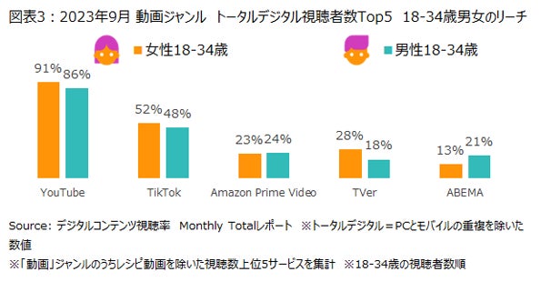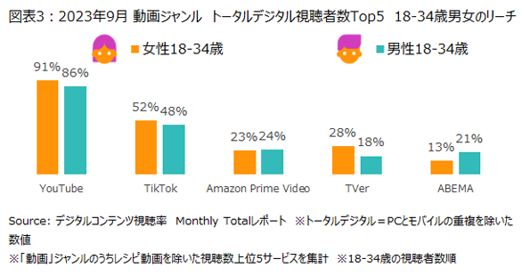 - 18-34歳では、「TVer」は女性への、「ABEMA」は男性へのリーチが高い