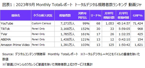 2023年9月のニールセン デジタルコンテンツ視聴率 Monthly Totalレポートによると、動画ジャンルにおけるレシピ動画サービスを除いたサービスのうち、PCとモバイルの重複を除いたトータルデジタルの視聴者数が最も多かったのは「YouTube」で7,273万人が利用していました。続く「TikTok」と「TVer」は、昨年の1.5倍以上に視聴者数を増やし、それぞれ「TikTok」は3,168万人、「TVer」は1,785万人が利用していました(図表1)。