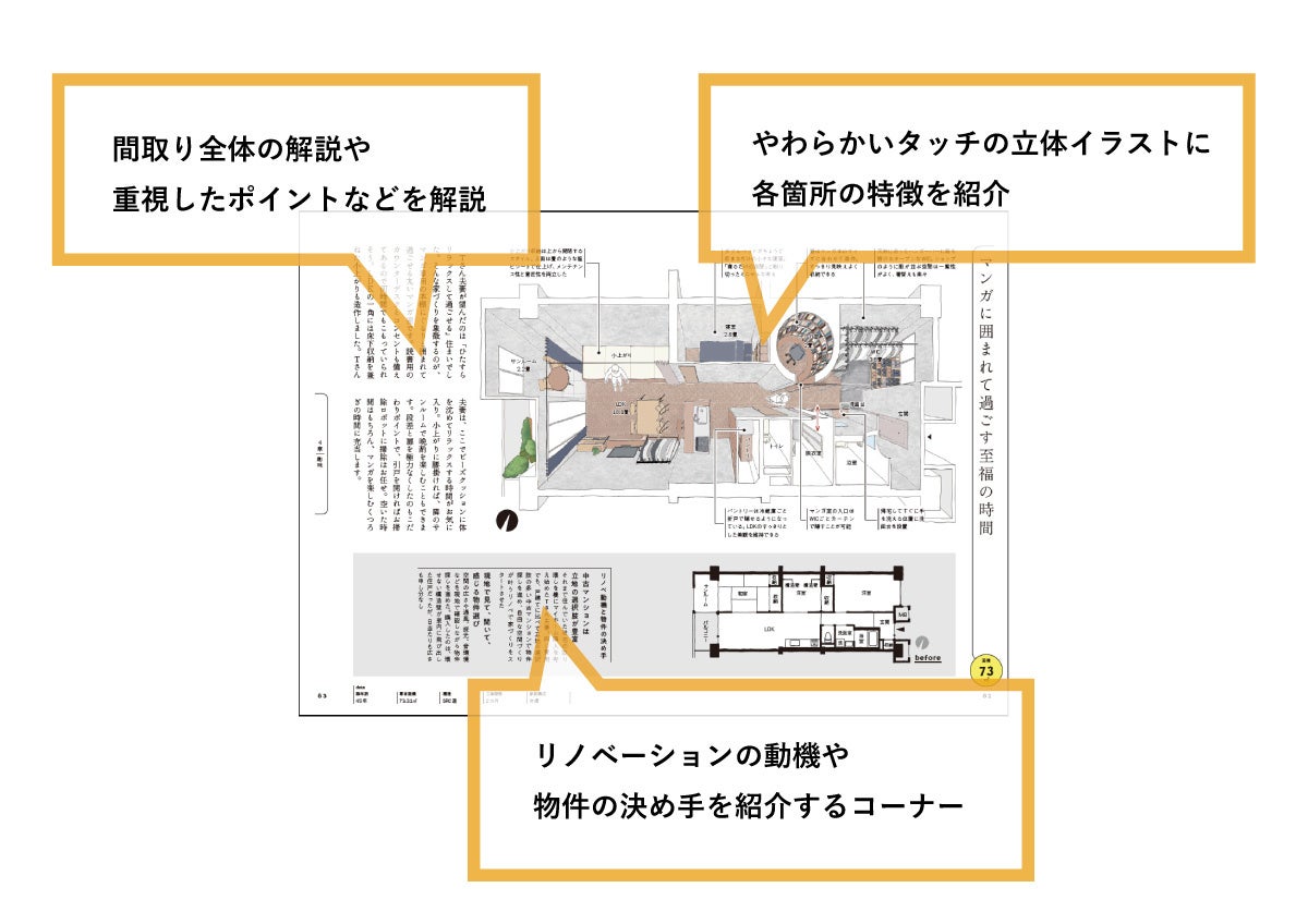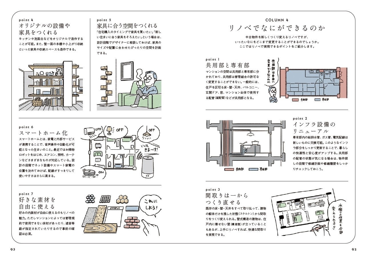 中古マンション探しとリノベーションのワンストップサービス「リノベる。」でリノベーションした全65のマンションリノベーション事例を家具や小物のレイアウトまで再現した立体イラストで紹介。リノベーション前の間取りも掲載しているので間取りの変化がよく分かります。住まい選びで多くの方が重視されるテーマ毎に事例をまとめ、全7章で構成。各事例では、工夫したポイントを中心に、中古マンション購入+リノベーションを選択した動機や物件購入の決め手になった点なども紹介しています。壁の色味や家具や建具の様子など、間取り図だけではわからないインテリアの様子がわかるのも特徴です。