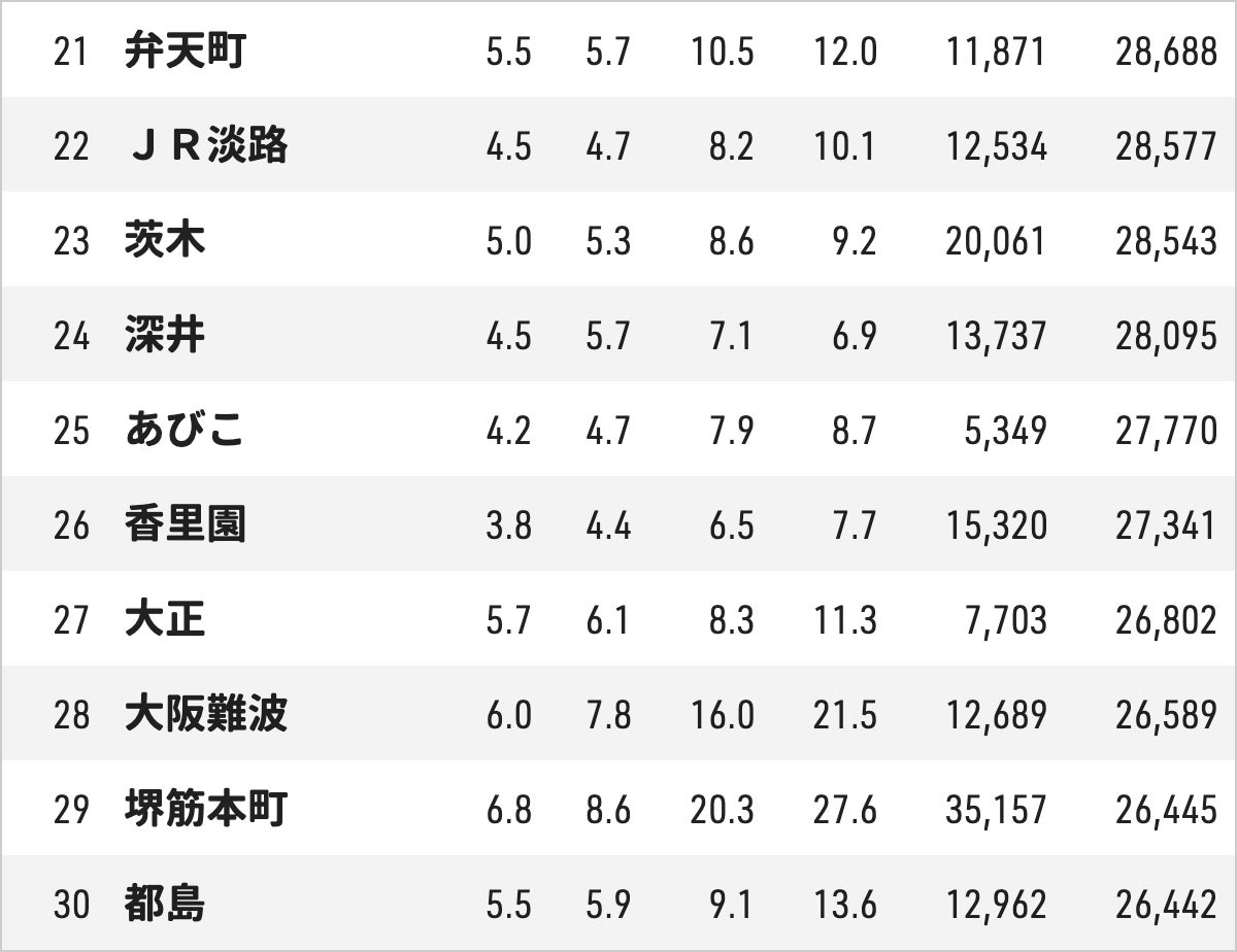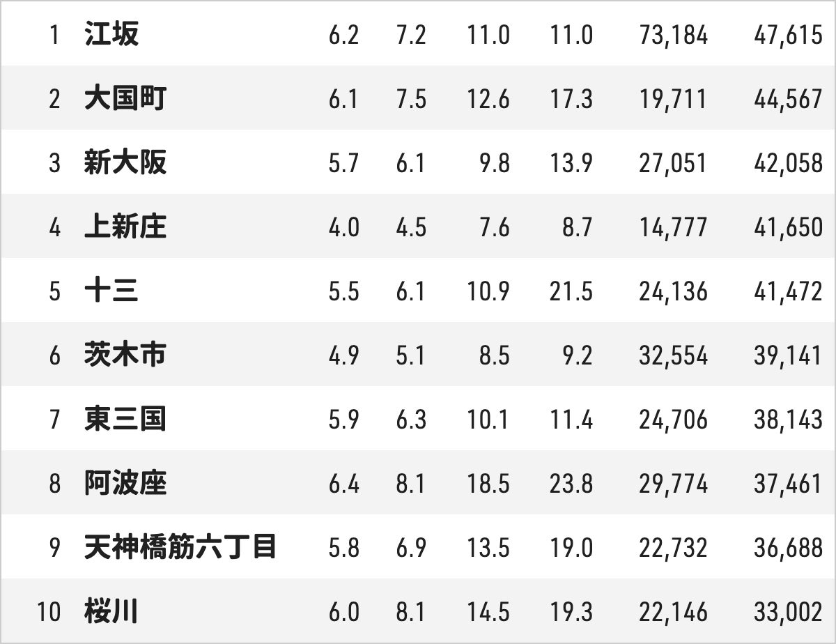 第1位はOsaka Metro・北大阪急行電鉄南北線の2路線が乗り入れている「江坂(えさか)」。