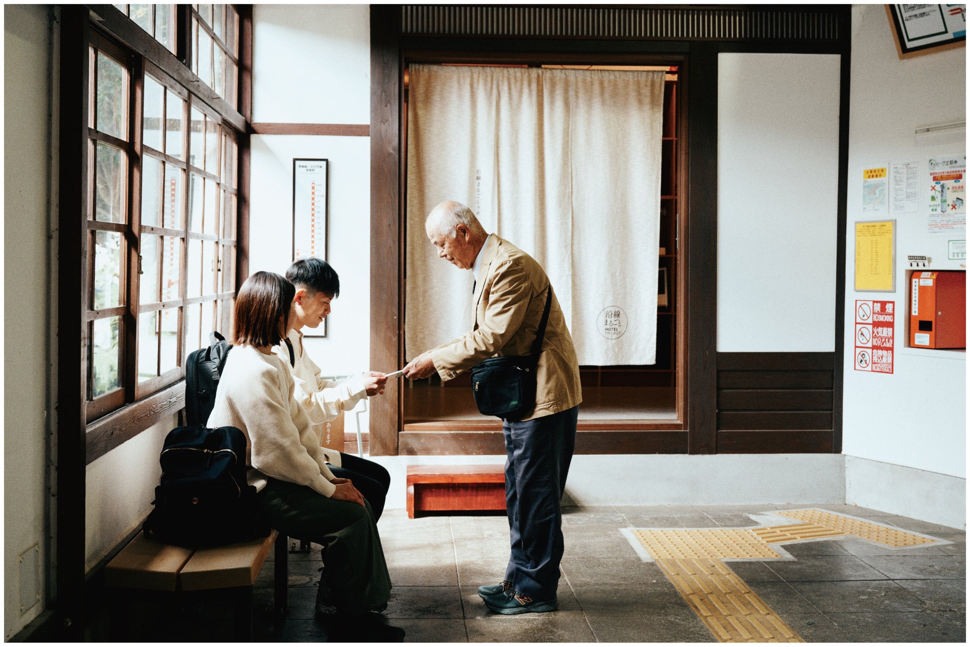 清々しい空気の中、駅の改札の暖簾をくぐるとそこはもうホテルのロビーです。地元に住むスタッフがお出迎えし、駅でチェックイン。「Satologue」までご案内します。