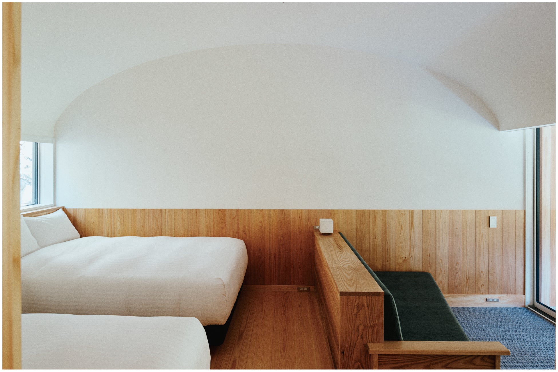 客室は、奥多摩の自然環境の中で心身が安らぎ寛げる空間として設計され、シンプルでミニマムな造りとなっています。木材は主に杉と椹(さわら)を使い、漆喰の壁で仕上げられ、柔らかな繭に包まれるような客室となっています。