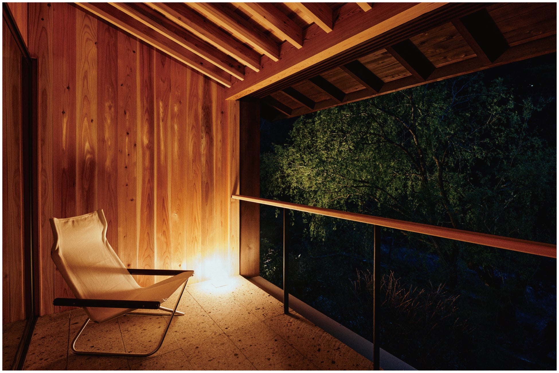 テラスは静寂な室内と四季折々の奥多摩の自然をつなげる接点の役割を担います。川のせせらぎや風の音、里山の風景を再現したお庭、対岸の木々の緑や、澄んだ山の空気を全身で感じていただける場所となっています。