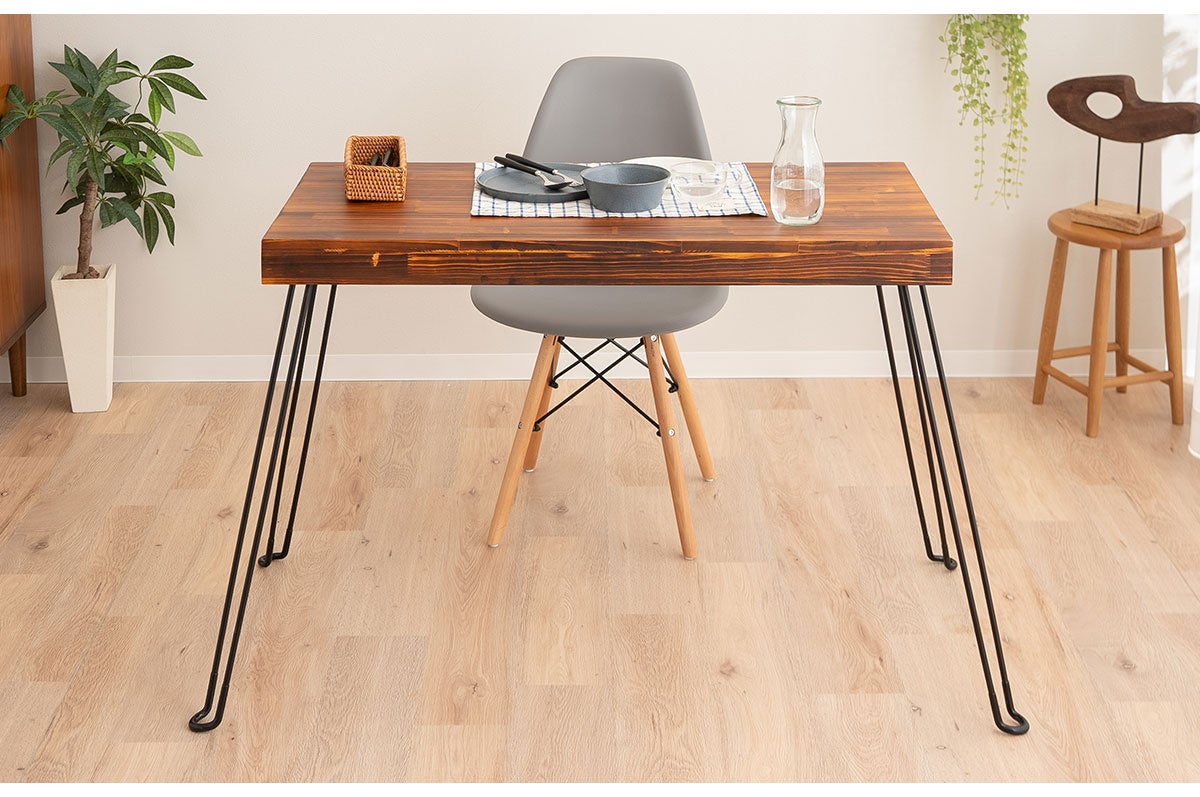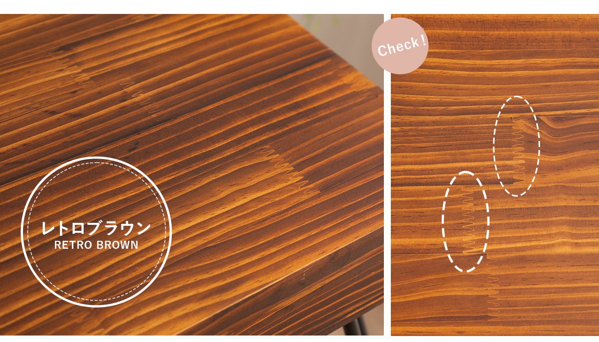 レトロブラウンの落ち着いたカラーと、しっかりとした厚みのある天板がアンティーク調の雰囲気を演出。天板には集成材のフィンガージョイントを採用。反りや割れが起こりにくく、耐久性が高いです。