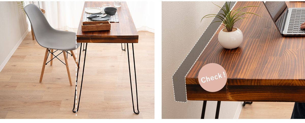 天板に比べて、脚が広がっているデザインなので、天板下のスペースを広々と使えるメリットがあります。※脚部が外側に広がるデザインなので壁にぴったりつけることができません。