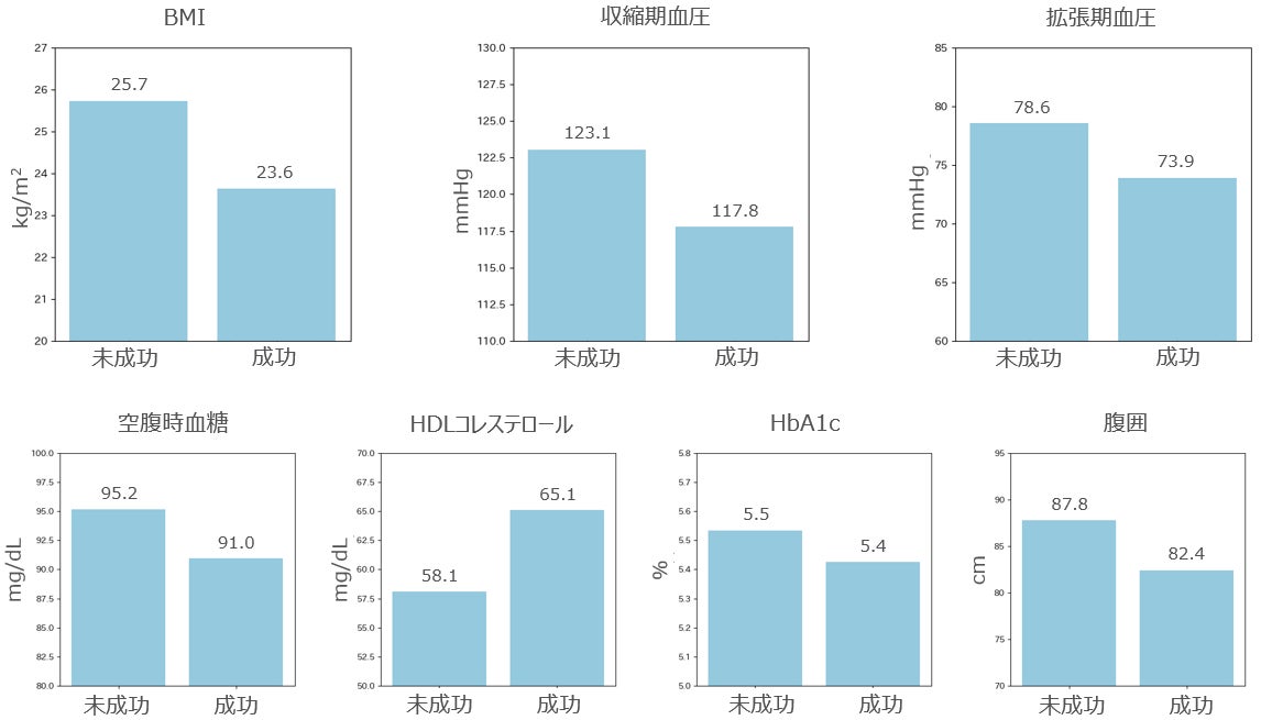 また、チャレンジ成功者と未成功者の結果を比べると、チャレンジの必要項目であるBMIや血圧に