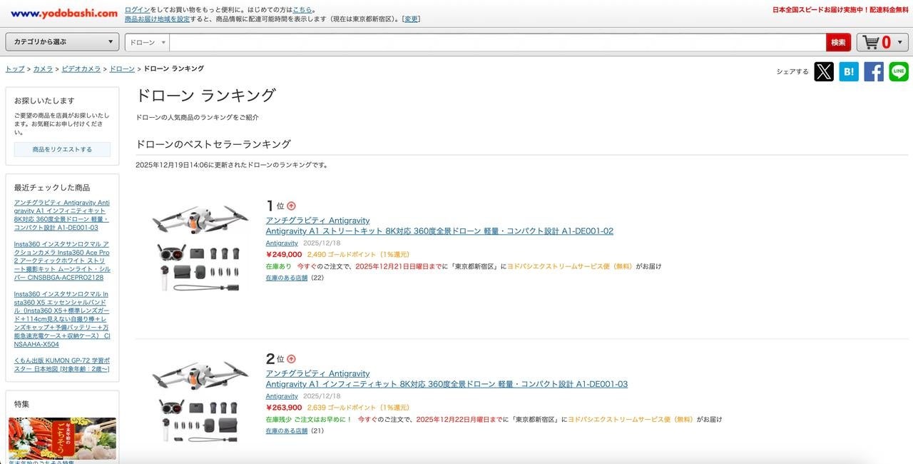 その中で、Antigravity A1は発売からわずか3時間以内に、国内大手家電量販店のドローン販売ランキングで第1位を獲得し、24時間以内にはトップ2を独占したことが明かされました。