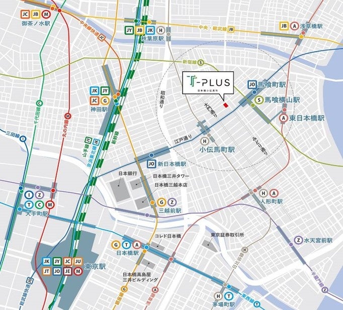 再開発が進む「東京」駅周辺エリアに近接し、東京駅から約1.6km圏に位置しています。JR「馬喰町」駅徒歩2分、地下鉄「小伝馬町」駅徒歩3分など、4駅4路線が利用可能なフットワークに優れた立地にあります。