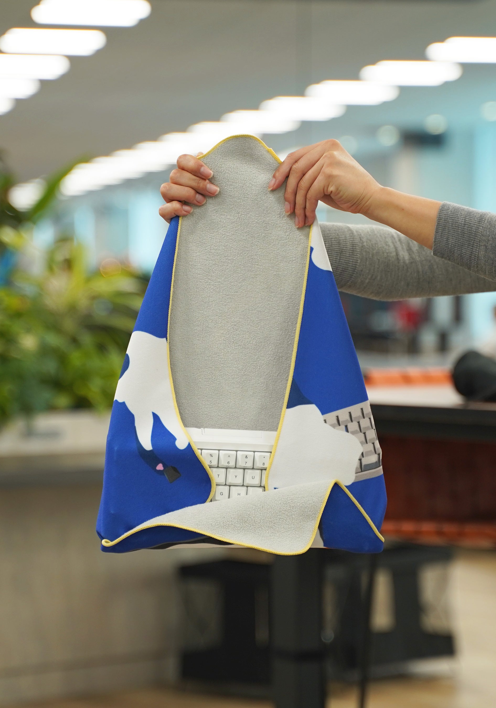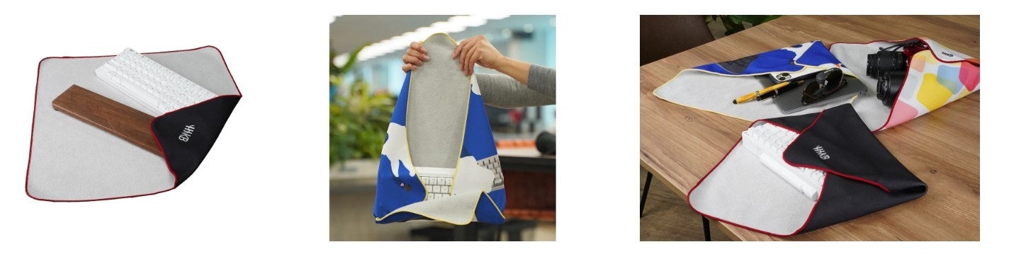 「くっつくクロスHHKB風呂敷」は、布の表裏生地に特殊加工が施されており、合わさった面がピッタリと貼り付くためどんな形状のものでも手軽に包めます。HHKBをはじめタブレット、モバイルモニター、カメラやVRゴーグルなど複雑な形状のモノも簡単に柔らかく包み込め、保護しながら持ち運ぶことが出来ます。