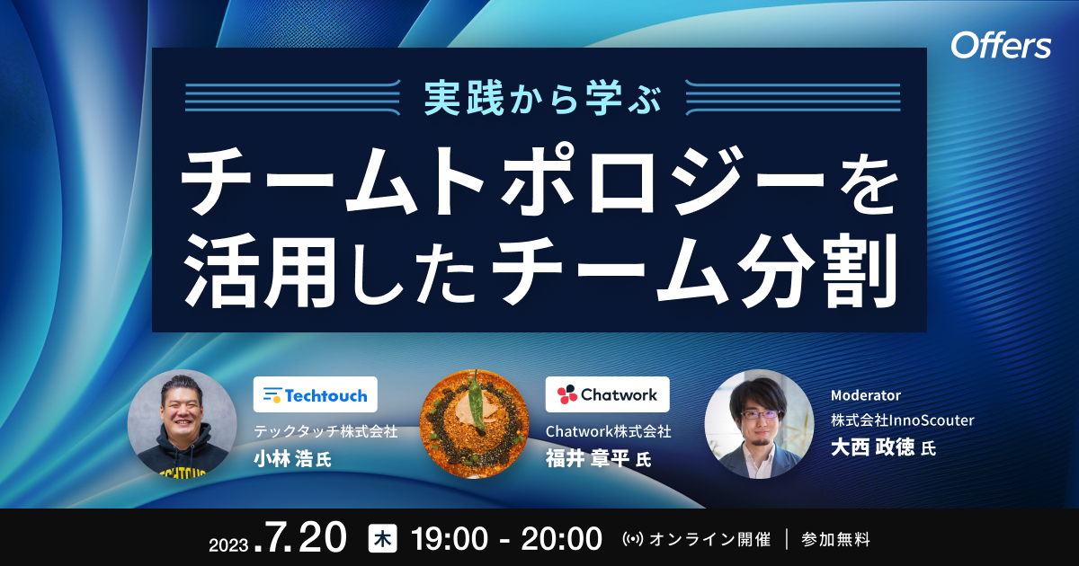 本イベントでは、テックタッチでEMを務める小林氏と、ChatworkでEMを務める福井氏をお招きし、スタートアップからミドルステージの企業においてどのようにチームを分割したのか、その難しさや、うまく行ったこといかなかったことなどを掘り下げていきます。