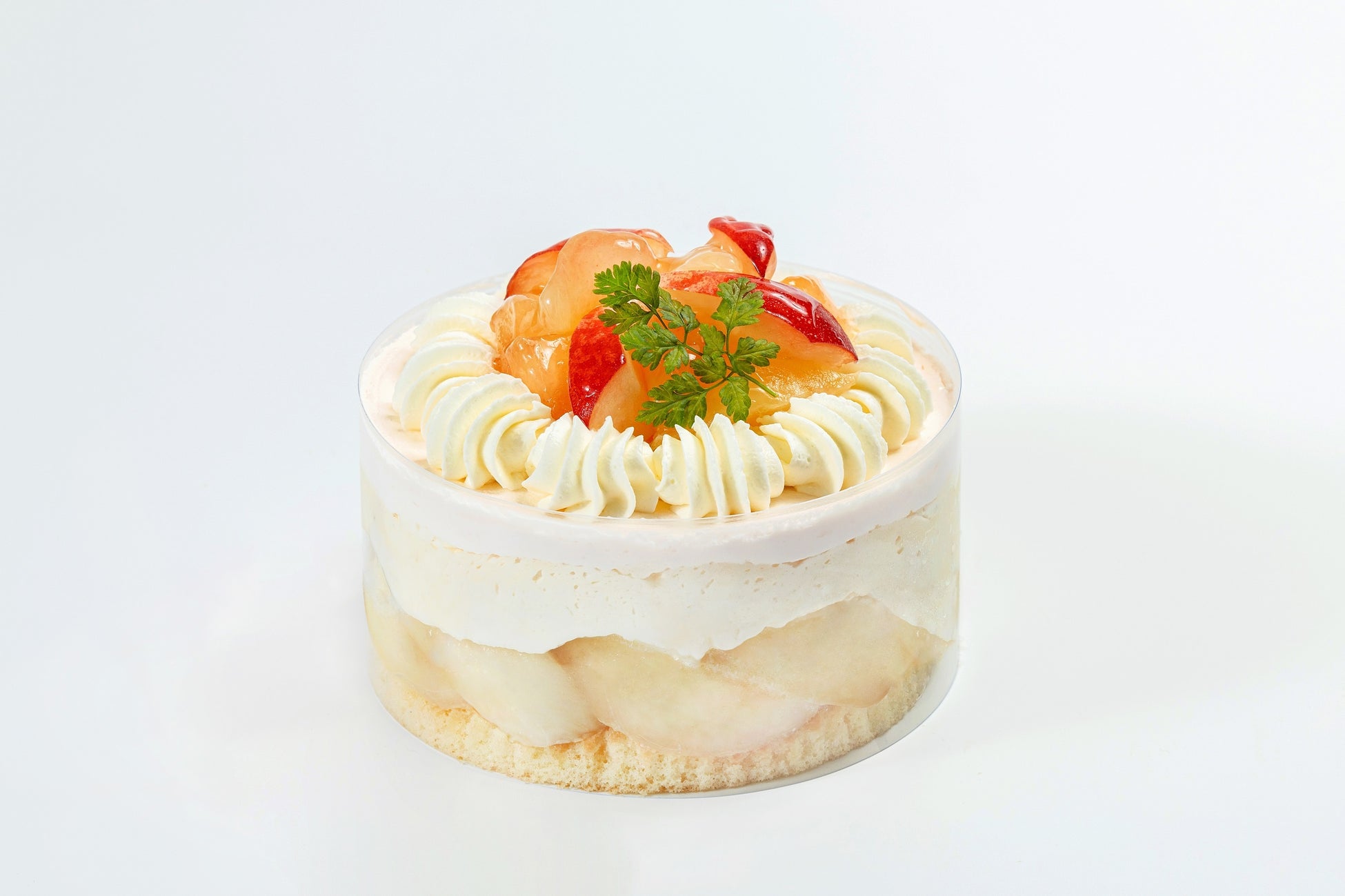 今年の「桃フェス」では、バリエーション豊かな新商品が続々登場します。中でも注目の商品『桃のフレジェール』は、ふわふわのスポンジ生地の上に桃、カスタードと生クリームを合わせた濃厚なクリームを重ね、みずみずしい桃を可愛らしく盛り付けたケーキです。少人数から楽しめる13cmのサイズ感と、透明なセルクル(円形の型)から旬のフルーツが覗く華やかな見た目から人気を集めている、季節ごとに展開するシリーズ商品です。