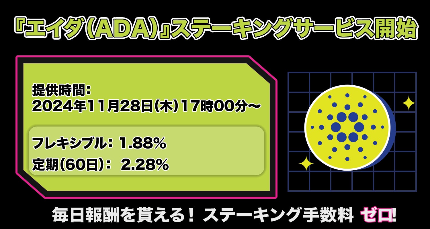 2022年8月に取扱いを開始した『エイダ(ADA)』につきましては、2024年11月28日(木)にADAステーキングサービスを追加することをお知らせいたします。