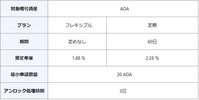 ADAステーキングサービスでは、ロック期間の制限がない「フレキシブル」プランと、60日のロック期間がある「定期」プランをご用意しております。