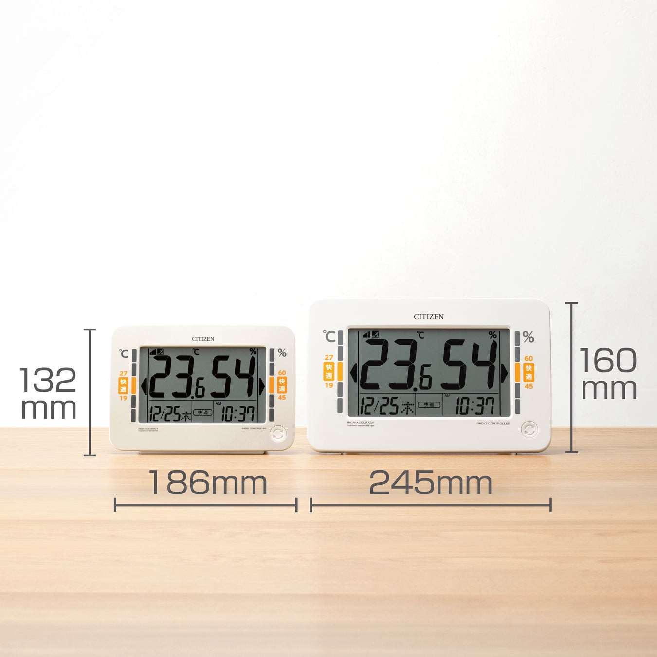 好評の8RZ232-0温湿度計をサイズアップし、掛置兼用にしました。壁に掛けて掛時計として、裏面のスタンドを使用して置時計として場所を問わず使用することができます。