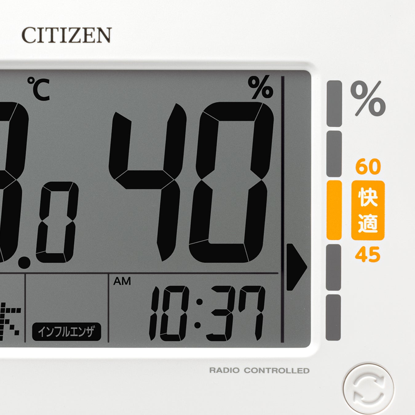 高精度センサーを搭載し、快適な場合は点灯表示、熱中症やインフルエンザになりやすい温湿度の場合は点滅表示でお知らせ。お部屋の環境目安をお知らせします。