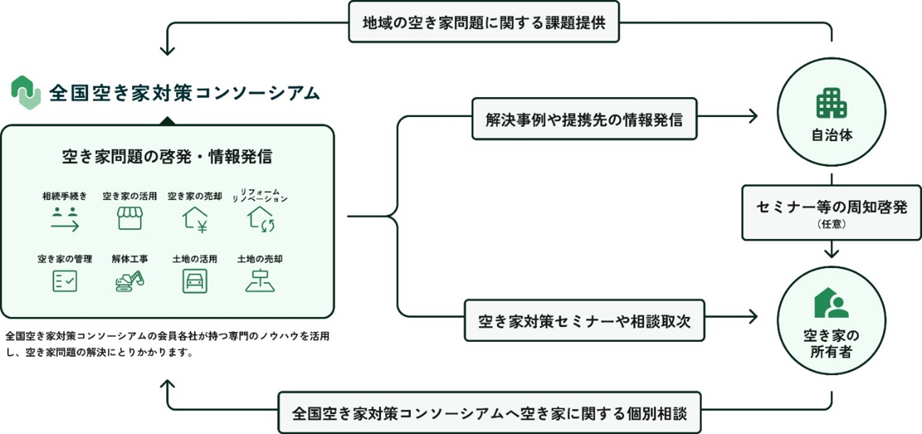 空き家の問題は相続、除却、売却、活用など様々な分野に関連しており、空き家所有者への支援は幅広い専門分野の情報を必要とするため、行政だけでは難しい状況です。そこで、空き家問題を具体的に解決する一助となるべく、核となる協議体として、「全国空き家対策コンソーシアム」を設立しました。独自に専門ノウハウを持つ事業会社・学術団体がコンソーシアムを形成し、知見を共有することで、各事業者の空き家所有者に対する啓発活動を強化し、具体的な課題解決の促進を目指しています。