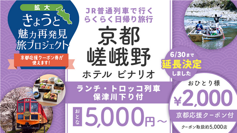 7月14日迄延長!京都府・大阪府・兵庫県・滋賀県・奈良県民限定!5,000円‼️さらに2,000円クーポン付往復JRで行く京都嵯峨野のホテルでランチ+トロッコ列車! 保津川舟下り付お得なパック