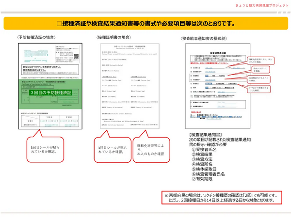 「きょうと魅力再発見旅プロジェクト」の利用には、旅行者全員が、ワクチンの3回接種歴またはPCR検査等で陰性であることを提示・確認することが条件となります。