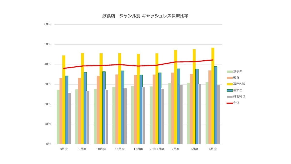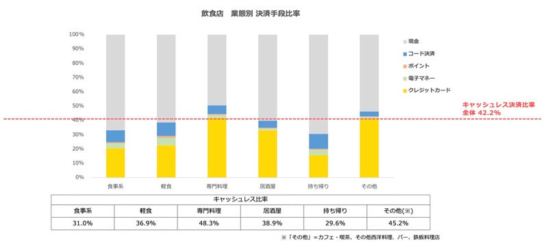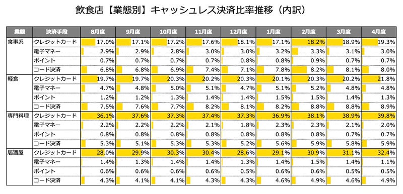 持ち帰りが30.1%から29.6%と減少したものの、それ以外の業態ではキャッシュレス決済比率が増加した。