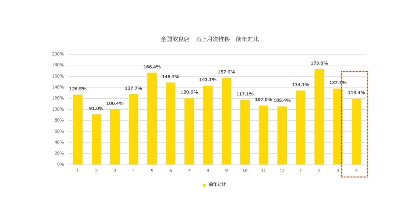 4月度の前年対比の売り上げ伸長率は、前月からは18.3pt減少したが前年対比で119.4%となった。
