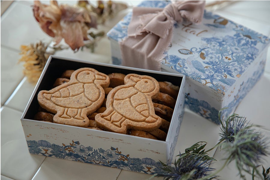 バレンタインシーズンに人気のクッキー缶に新フレーバーのクッキーが加わった、「オレンジスペキュロスとカカオグラス」、「ラムレーズンとラムグラス」、「いちじくティムットペッパーとレモングラス」、「カモサブレ」の4種類の詰め合わせ。tealのロゴのモチーフであるカモのサブレは1枚ずつ手づくりしています。